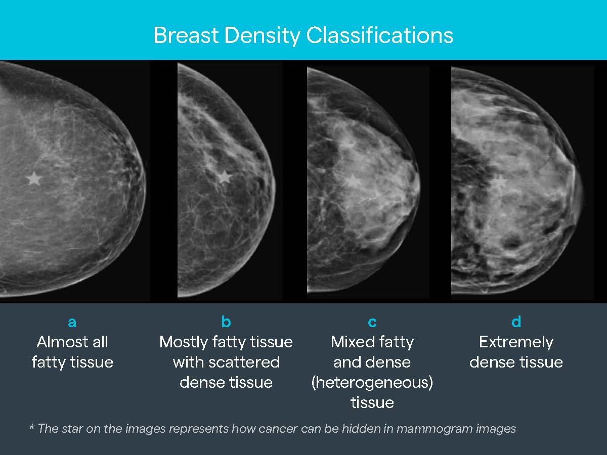 Breast density plays an important role in cancer detection - because denser breast tissue can increase the risk of breast cancer. It also influences screening accuracy, as dense breasts reduce the effectiveness of mammograms, hiding cancers and making cancers more difficult to see on mammograms.